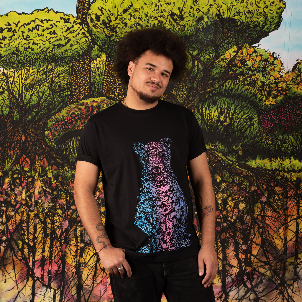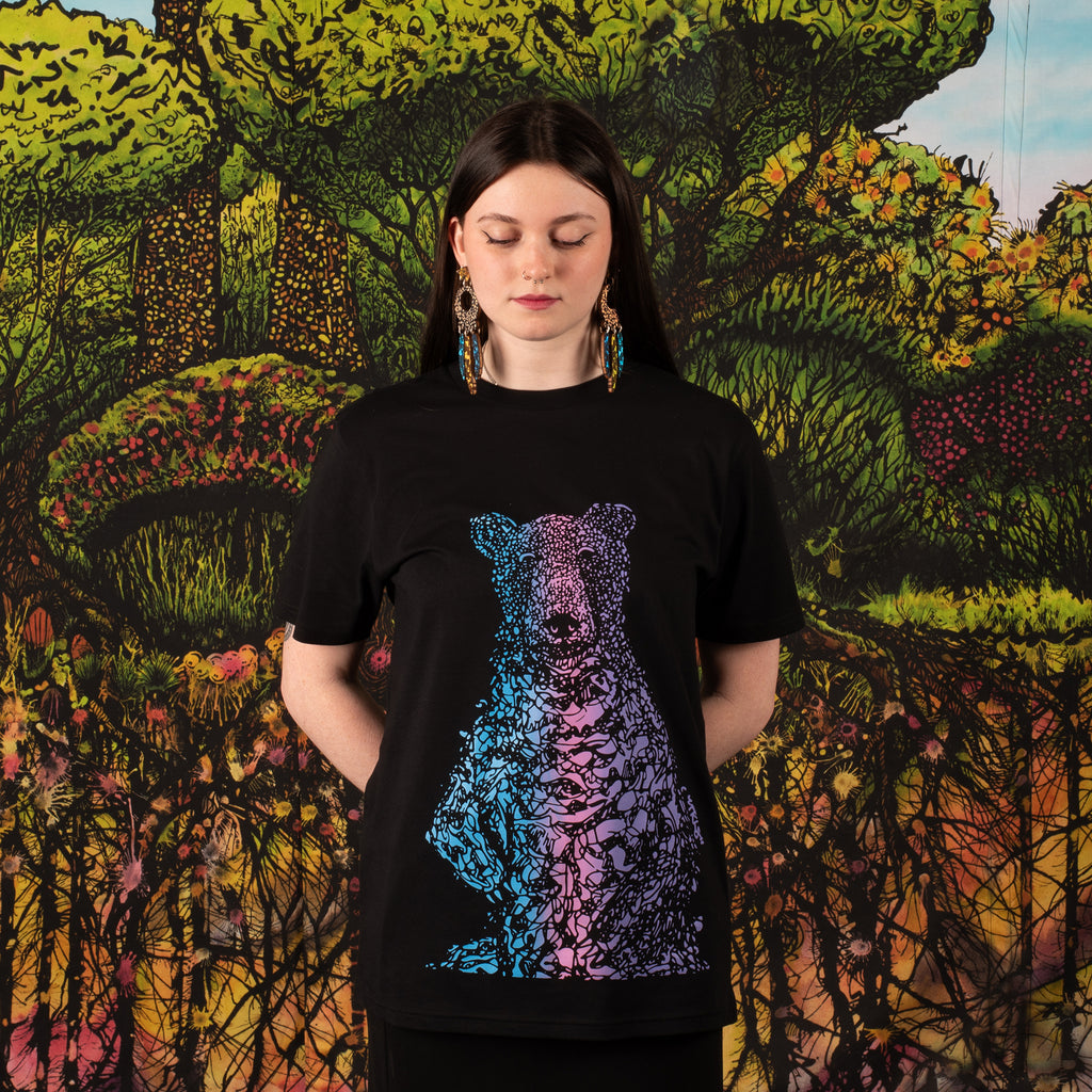 Artwork: "Blueberry Bear" | T-shirt: Black | Ink: Fluro Blue/Pink/Purple fade
