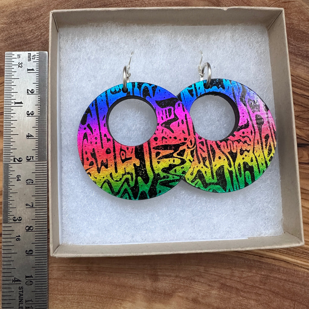 These eco-friendly, hand-printed earrings are handmade by us in Bristol in all colours of the rainbow, using wood from sustainably managed forests. Each pair has a unique reflective print which twinkles and shifts in the light.