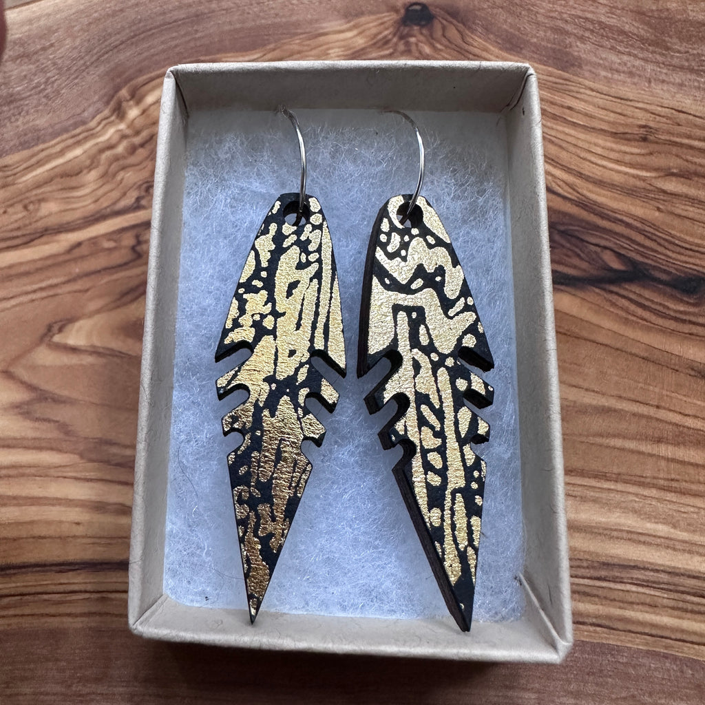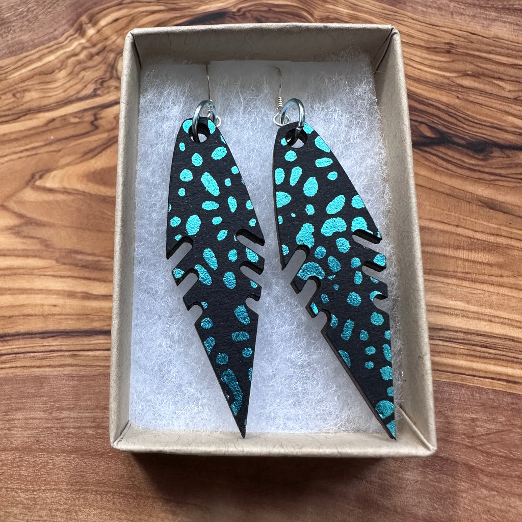 These eco-friendly earrings are inspired by the natural world, in particular the iridescence found in nature.  Bright colours that shift and change, reflect and glow in the light.  Think Humming birds, Jewel beetles and Morfo butterflies.  It's the innate beauty of these kinds of creatures, alongside our hope for a more sustainable future, that has formed the inspiration & process we use to make these eco-friendly, wooden earrings for our design label Totem Tiger.